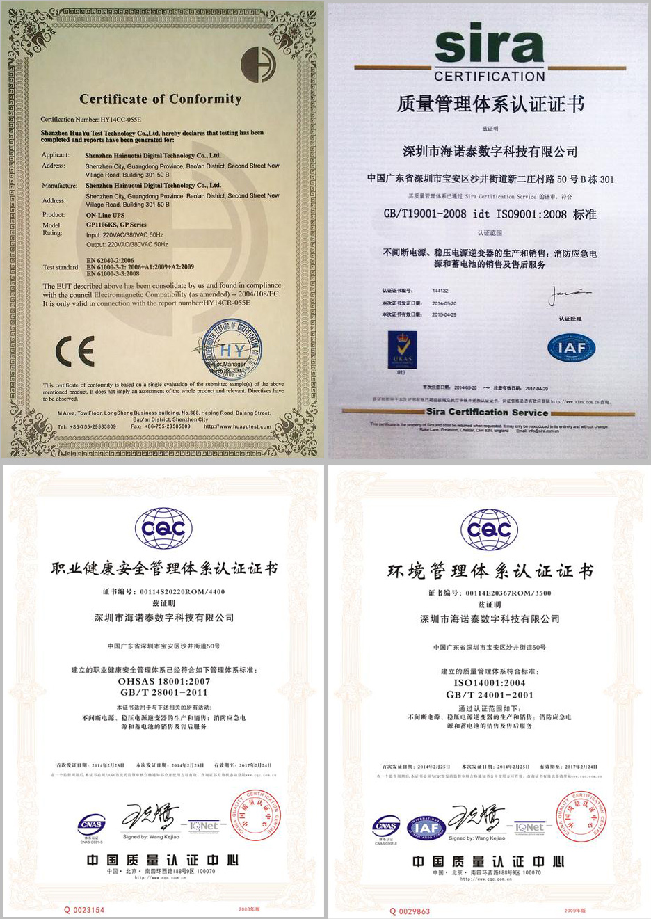 海诺泰已获得ISO9001、ISO14001、CE、OHSAS 18001认证